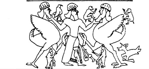 Fenti okfejtésünkre kiváló példát nyújt ez a kép, amely valószínűleg az Újasszír korból származik. Általában az asszír királyt ábrázolták a vadász képével, a fenti pecsétnyomó viszont a szárnyak segítségével egy mitológiai dimenziót is megnyit az ábrázolás előtt, melyet mind állatokra, mind pedig emberekre alkalmaztak az asszírok a korszakban. Az ábrázolt isten beazonosítása nem egyértelmű, vagy Ninurta, a háború és a vadászat istene, vagy Adad, a vihar isten is szóba jöhet.[10]