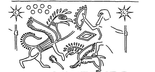 A férfi hosszú szakállat visel, egyik lábán egy griffhez hasonló vegyes lényre[12] támaszkodik, jobb kezében talán fegyvert tarthat, melyet a szimbolikus Vénusz csillag díszít. Vele szemben, támadó állásban egy griffmadár, közöttük egy rombusz, amelynek jelentése az ókori keleti ikonográfiában nem világos, ám valószínűleg az óvó, rontást távol tartó erőt szimbolizálja. A férfi képével nem azonosíthatjuk be egyik istenséget sem kétségek nélkül, ám a képi megjelenítés, a mitológiai elemek valószínűsítik, hogy egy mennyei, mitologikus harc elbeszélése ez a művészet eszközeivel. Ami a fejezet témája kapcsán különösen fontossá teszi, az a harcos bal kezében található íj, melyet nem támadó állásban tart, hanem védekező pozícióba helyezkedik, s úgy tűnik, hogy mint védekező fegyvert használja az íjat.[13]