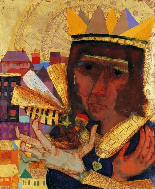 Természetesen én sem mehetek el szó nélkül a Darázskirály (1963) vagy a Dózsa György rézkarcsorozat mellett. 1956-os diplomamunkáján későbbi műveinek szinte már valamennyi jellemzője megtalálható: zsúfolt képtér, expresszív figurák, az emberek és a szárnyas angyalok, a helikopterre emlékeztető repülő szerkezet, és a mennyországra utaló cím. Felfedezhető rajta Dürer klasszikus, aprólékosan kidolgozott rajzstílusa, illetve a levert felkelés epizódjait kísérő furcsa, látomásszerű szimbólumok, szárnyas figurák. Vagy épp a különös repülőszerkezet, melyben ─ Da Vincihez hasonlóan ─ a kitalált technikai szerkezetek iránti vágya manifesztálódott. A Dózsa-oltáron, vagyis az izzó trónszéken kivégzett alak szinte királlyá magasztosul, sőt az oltárforma miatt Trónoló Krisztusként tündököl – adja elém a kép értelmezése. Mártíromsága teszi királlyá, kigúnyolása válik megdicsőülésévé. Kondor e sokrétű újszerűség, szinte merészség ellenére (vagy talán éppen ezért) diplomavédő beszédében kizárólag a rézkarc-sorozat technikai ismertetésére szorítkozott. Bernáth Aurél, a festő tanszék tanára ezt szóvá is tette, hiányolva az alkotóban zajló érzelmek feltárását. A vizsgabizottság több tagja emellett a mű időbeli ellentmondásosságát kritizálta, anakronisztikusnak ítélte a ma már KOGART tulajdonában lévő kincset. A Darázskirályon is a Dózsa-féle rézkarchoz hasonló kettőség érződik. Az uralkodói jelvények mellett a Krisztus-párhuzamot olyan hagyományos ikonográfiai elemek teremtik meg, mint a korona, az aranyalapon kirajzolódó glória, vagy a Krisztus-képekről ábrázolásokról ismert kéztartás. Az apokaliptikus vének, vagyis az ótestamentumi igaz királyok szolgálhattak mintaképül a királyportrékhoz, mint amilyen az Öreg király (1969) vagy a Baltás király (1966) képe.