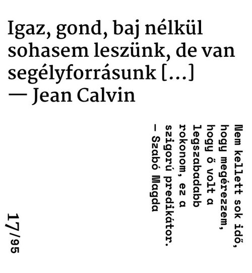 A reformáció 500 éves évfordulóját ünneplő idei esztendőben azonban a budapesti Kálvin téren történt valami más is. Valami olyan új született, amelynek gyökerei valóban az ötszáz éves múlt értékeibe nyúlnak, ugyanakkor friss termései a mának szólnak. Ez pedig a 2017. május 16-án átadásra került úgynevezett Kálvin téri installáció. Nem egy büszke szoborkompozíció nehézkes nagyotmondása, nem is egy rendezvény pillanatnyi lufi eregetése a semmibe, hanem a református szellemiséghez hű, puritán Ige-magvetés, evangéliumi alapkő-letétel. A Kálvin tér felújításakor lerakott járófelülete „K-köveinek” négyzetei közé elhelyezett olyan 95 darab kőlapról van szó, amelyeken a reformátorok első generációjának legmeghatározóbb gondolatai, valamint korunk neves íróinak és gondolkodóinak mondatai olvashatók. Intellektuális emlékmű a Kálvin tér átmenő gyalogos forgalmának alapjaként. Zseniális ötlet. Szabó Levente építész és Polgárdi Ákos grafikus alkotása.