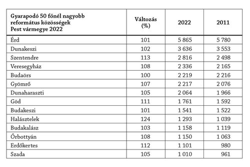 Pest vármegyében 78 olyan település volt 2022-ben, ahol 50 főnél nagyobb és az elmúlt 11 évben növekvő számú magát reformátusnak valló magyar állampolgár él. Még olyanból is 27 van, ahol 500-nál többen vallották magukat reformátusnak. Az alábbi településeken több mint 1000 ember volt, aki reformátusként jegyeztette be magát a népszámláláson Pest vármegyében.