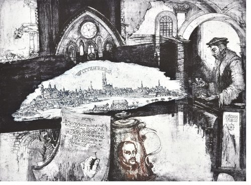 Nézd csak, kedves Érdeklődő, micsoda öröm és megnyugvás sugárzik a Rembrandt nálunk járt (2006) című rézkarcán, ahol minden a helyére kerül! Egységes és egészséges a világ. Grafikusként Rembrandt ismert rézkarc-önarcképét rajzolni egyet jelent a tanítványi méltósággal, a céh mesterségbeli hagyományainak folytatásával úgy, mintha a nagy holland festő a háta mögött állva adná át tapasztalatait a mai mesternek. S Rembrandt nem Amszterdam képére, hanem Debrecen szürkemarhával, szénásszekérrel, vándorlegénnyel és a sarokban szerényen háttal meghúzódó művészházaspárral (Szilágyi Imrével és Kóczián Melindával) tarkított látképére könyököl. Rembrandt alakját pedig a távoli helyszínek és korszakok koccintására felkínált két „oszlopos” kupa, a XVII. század Debrecenének országosan híres ötvösremekei koronázzák. Egy kereten belül olyan természetes az európai kultúra egymásba kapcsolódása, mint a lélegzetvétel.