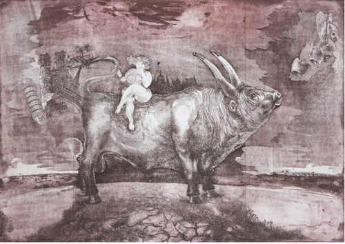 Végül, de nem utolsó sorban, hogy a mestert tovább ne háborgassuk, inkább hagyjuk nyugodtan alkotni őt, kiválasztunk még egy szakmai szempontból is kiváló remekművet, hogy az antik megújító erejét igazoljuk vele végérvényesen. Ez pedig az Europé nálunk? (2008) címet viselő rézkarca. Többen írtak már róla, de a mókás hangvétel mellett érdemes megemlíteni a műalkotás évezredes kulturális rétegződését. A központi téma klasszikus, Ovidius és Horatius nyomán terjedő eredete földrészünknek, azonban debreceni grafikusművészünk kezében Zeusz a szürkemarhabika alakját öltötte magára, aki a kolompok hangját követi, amelyekkel mennyei angyal harangoz néki: gyere csak, gyere, erre, erre! Europé, a mindig újjászülető ifiasszony pedig a hortobágyi szikes pusztán bandukoló bika hátán kerekded, csábító idomaival Országházunk előtt azon kuncog, hogy az állat farkának bojtos végivel – amin barokkos puttó bóbiskol – végleg búcsút int a Pisai ferdetoronynak éppúgy, mint a párizsi Notre Dame-nak. A Nyugatnak. Európa keletre érkezett. Vajon a 2008-as gazdasági válság iróniája ez? Vagy megérzése annak a reménynek, hogy Európa mi vagyunk?